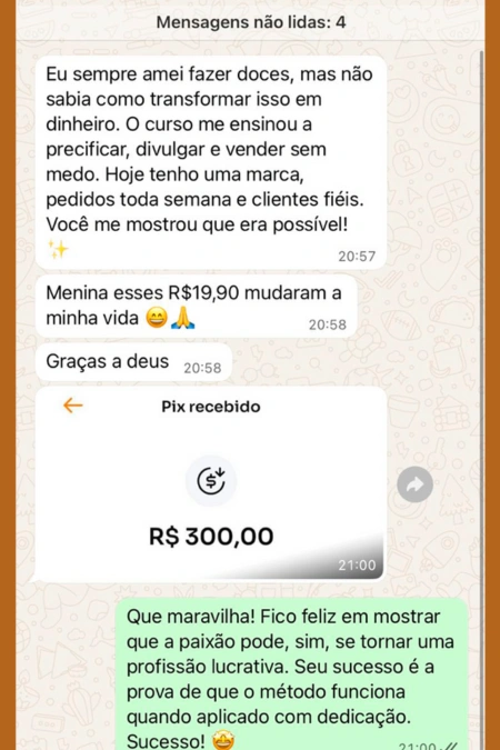 Você terá em mãos não apenas receitas, mas o mapa completo que te guiará do zero até um negócio lucrativo de até R$ 4.500 por mês. Todo o passo a passo, as estratégias de lucro e os bônus exclusivos serão seus para acessar imediatamente e para sempre.